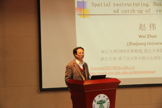 浙江大学教授、空间经济学专业委员会副主任委员赵伟做了题为《经济空间重构、二重开放与区域赶超》的主旨演讲。