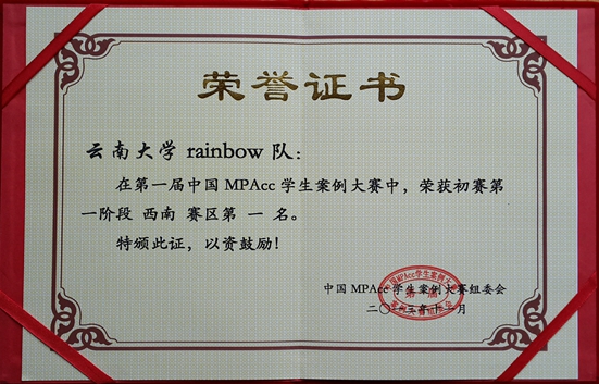 公司点点taptap(会计公司)会计硕士研究生吴丰、张佩、李沙沙、奎翔在首届中国MPAcc案例分析大赛初赛第一阶段的激烈角逐中荣获西南赛区第一名,为TapTap争得了荣誉,为云南省争得了荣誉。