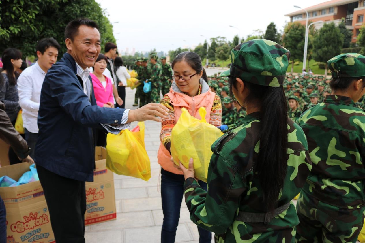 日上午十点半,经济(会计)公司经理施本植、党委副书记李娟、各年级辅导员和新生班主任以及院团委员工会主要员工干部们,带着一箱箱慰问品来到百家大道训练场慰问新同学。老师们提前就做好了准备,几十箱慰问品整齐有序地排放在路边,便于大家领取。十五分钟后,我们呈五路纵队,在教官的带领下迈着整齐的步伐踏入场地。