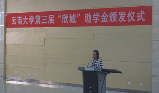 2013级金融学新生赵静远同学,代表获得资助的同学发表了感言,在她的发言中,表达了对云南欣城防水科技有限公司的感激之情,同时也表达了受助同学们立志好好学习回报社会的决心。