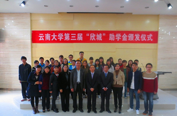 施经理与刘冠麟总经理为2013年度获得“欣城”助学金的20名同学颁发助学金,并与同学们合影留念,现场气氛欢快、融洽。
