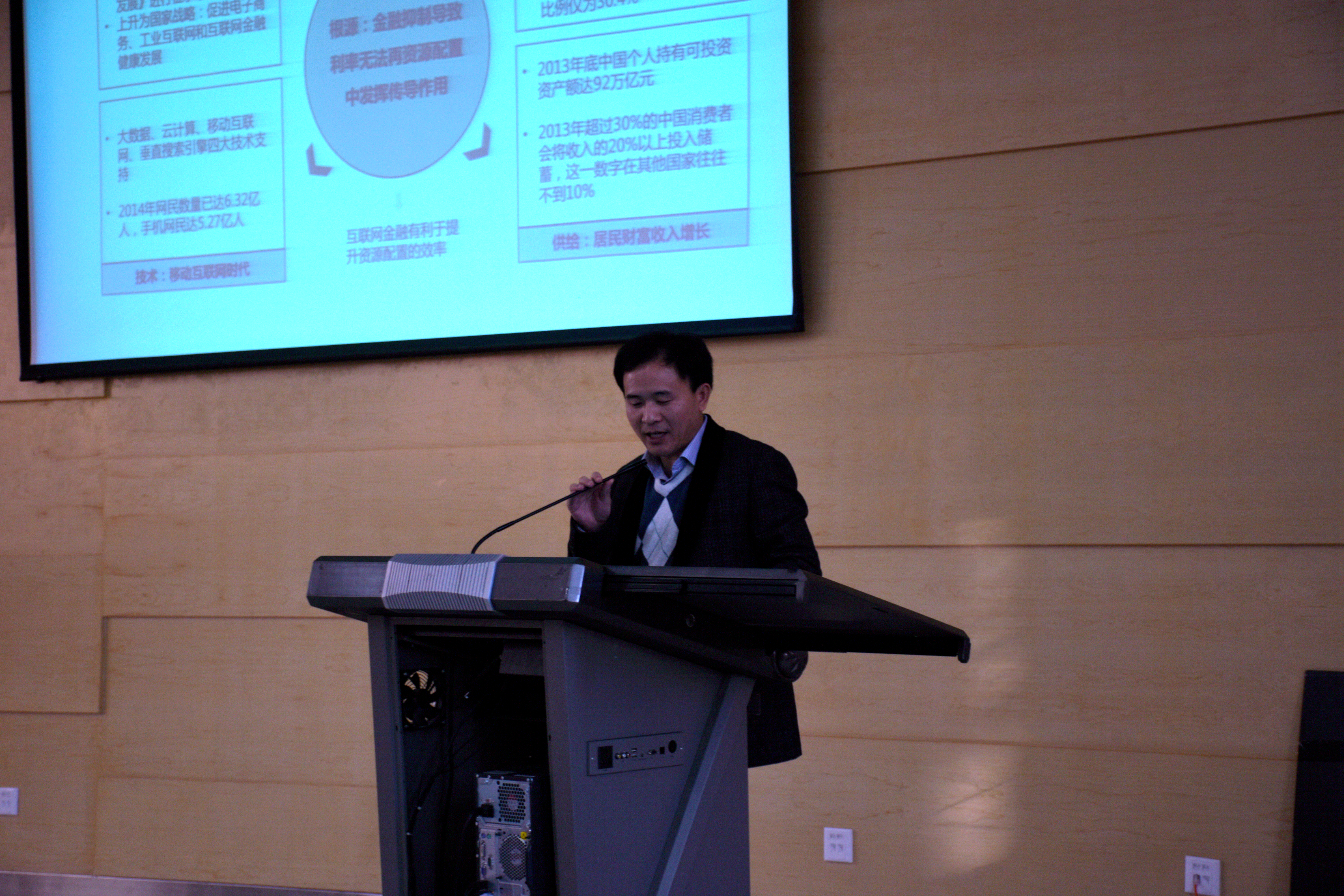 讲座在经理施本植老师的主持下开始。讲座伊始,黄英君便从经济的“新常态”谈起,以中国的互联网+模式为例,阐明了“新常态”的概念。黄英君认为,互联网技术以及小微企业的迅速发展使得互联网用户越来越广泛,随着互联网金融的发展模式多元化,支付结算,网络融资,虚拟货币等融资方式逐渐普及,以e租宝,p2p为主的互联网金融渐渐为人们所熟知。同学们在黄英君老师的讲解下,对互联网金融有了更深入的了解和认识。