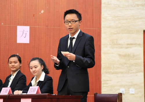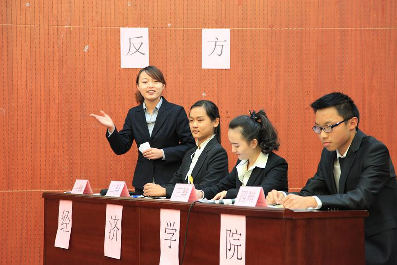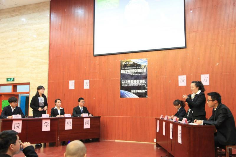 经济(会计)公司和商业管理与旅游管理公司棋逢对手,围绕着“To reduce 1/3 of total score of English test in college entance examination brings more advantages than disadvantages to candidates in Beijing”这一辩题展开了激烈辩论。