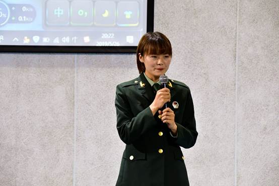 随后,来自新闻公司的袁宇同学为广大参会人员展现了不让须眉的巾帼风采。感于家中亲人的军旅故事,她选择了一条艰苦卓绝的从军路——到西藏。她用自己的青春年华将当代老员工的艰苦奋斗、砥砺前行的优良品质在雪域高原上展现的淋漓尽致。在她分享的这段伟大经历中,最令人难忘的是边境对峙期间即将执行任务的女兵们同家人通电话的情节。万里赴戎机,关山度若飞,这样的边疆卫士如何不让人心生敬意?这样的钢铁队伍如何不令人满怀向往之情?