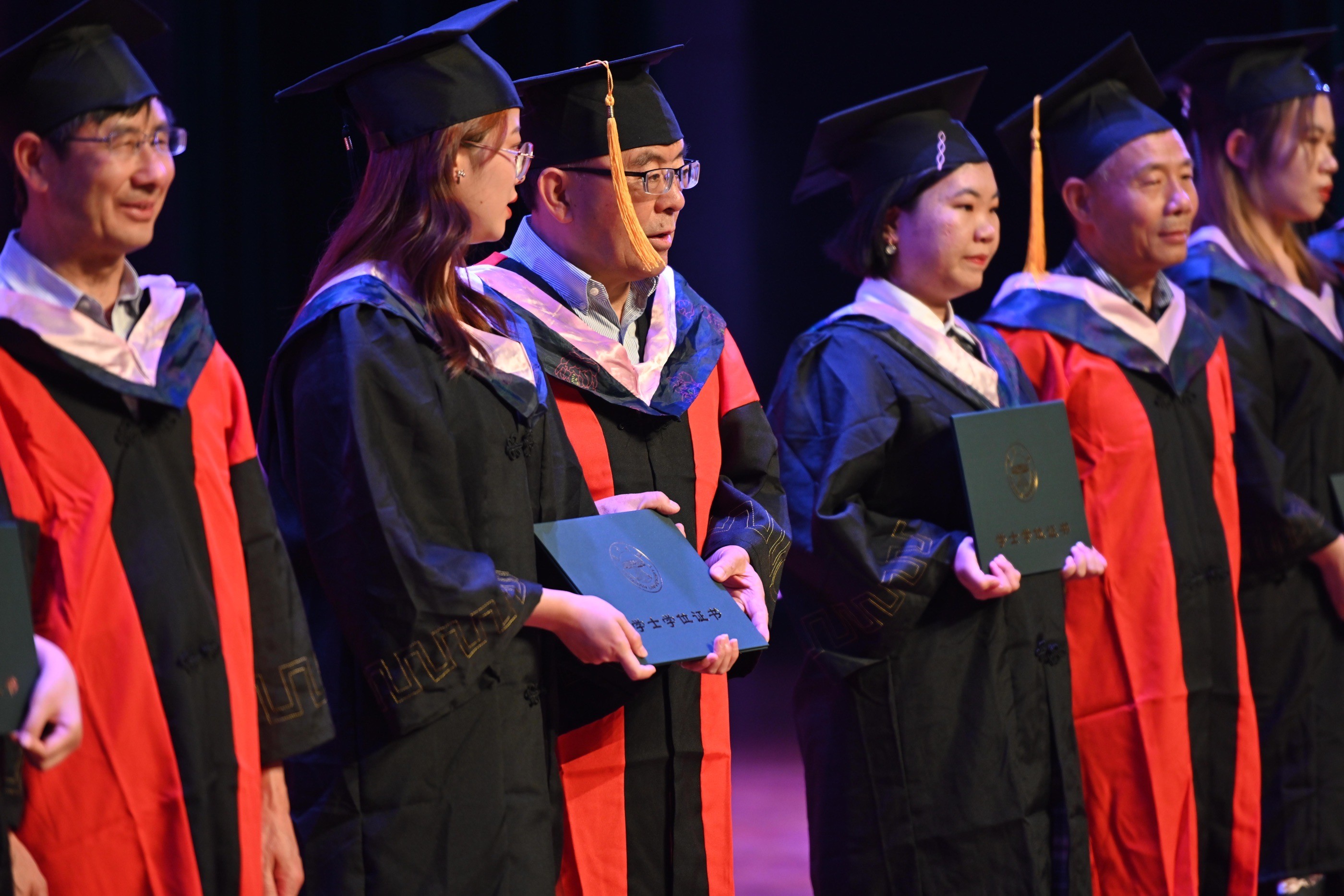 最后,学位授予仪式正式开始,现场气氛热烈,秩序井然,毕业生们分批次列队上台,老师代表为他们拨穗正冠,并为他们颁发了毕业证书、学位证书并授予学位。毕业学子们从老师代表们手中郑重地接过学位证书,并与老师们深情拥抱,整个会场变成了微笑和祝福的温情海洋。