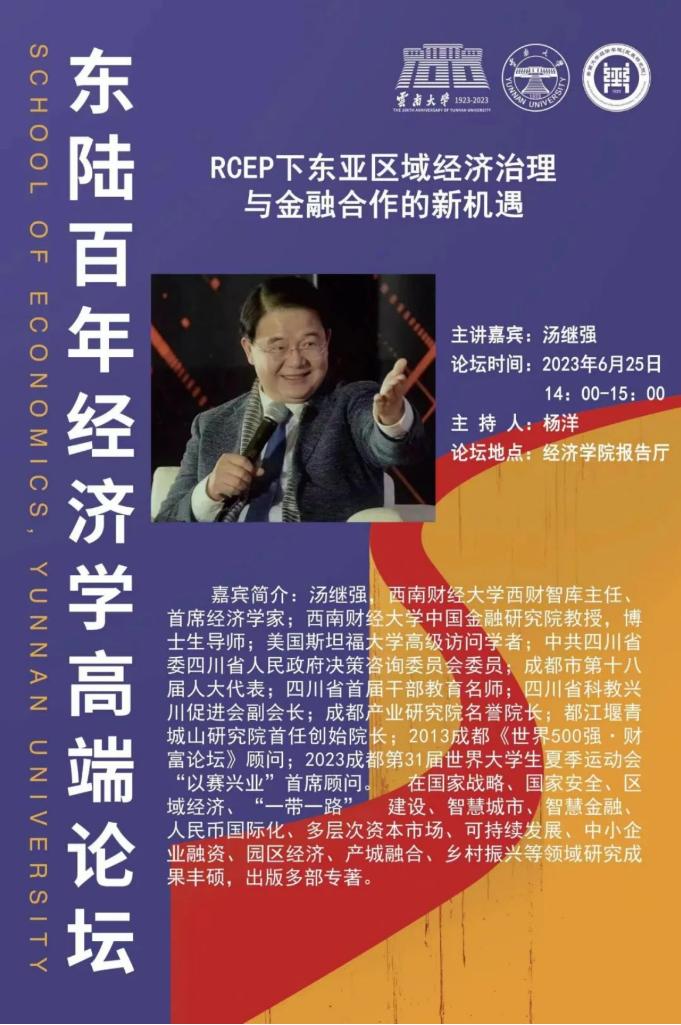 2023年6月25日,西南财经大学西财智库主任、首席经济学家汤继强教授应邀为东陆百年经济学高端论坛作题为《RCEP框架下东亚区域经济治理与金融合作的新机遇》专题报告,并就跨区域合作、云南对外开放等领域开展座谈交流。
