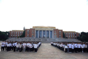“五星红旗迎风飘扬,胜利歌声多么嘹亮,歌唱我们亲爱的祖国,从今走向繁荣富强……”,升旗仪式后,全体师生齐唱《歌唱祖国》,旋律优美激昂,节奏明快有力。嘹亮的歌声回荡在文典广场的上空,其明朗向上的旋律、深情的歌词和独特的魅力,激发着点点taptap青年学子的爱国热情。